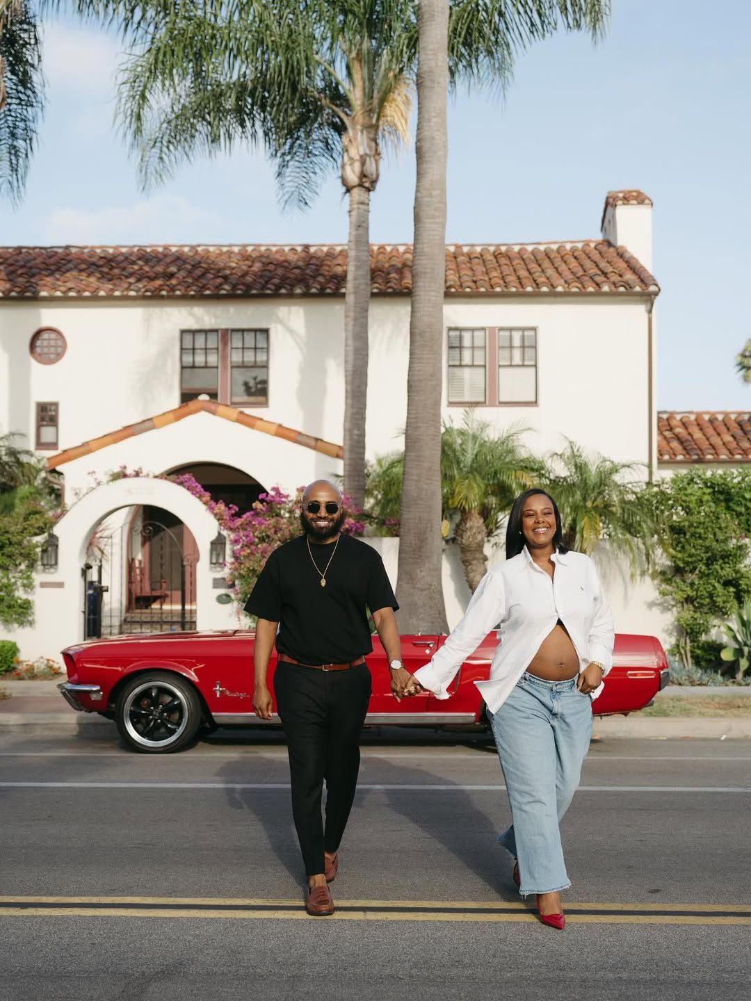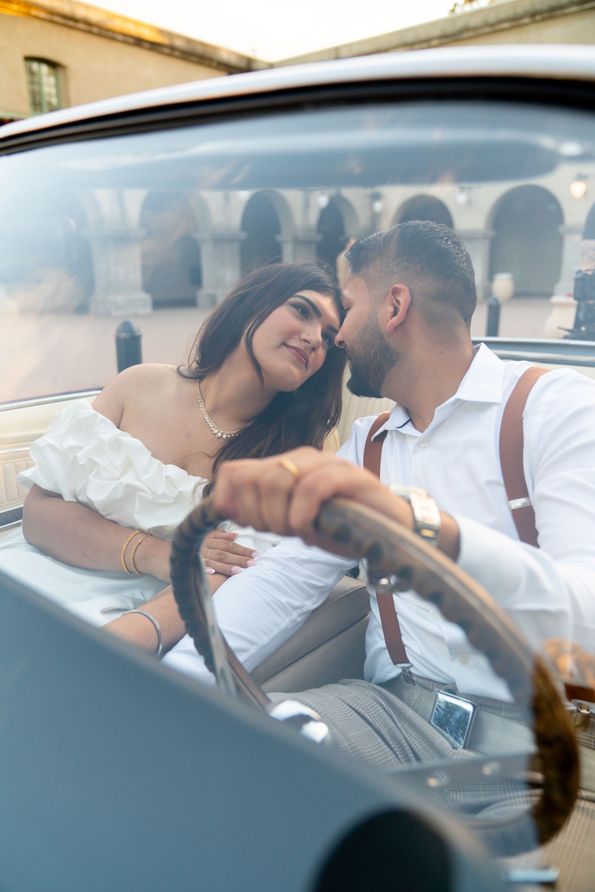 A golden hour embrace by the Mustang - timeless, passionate, and full of just married magic.